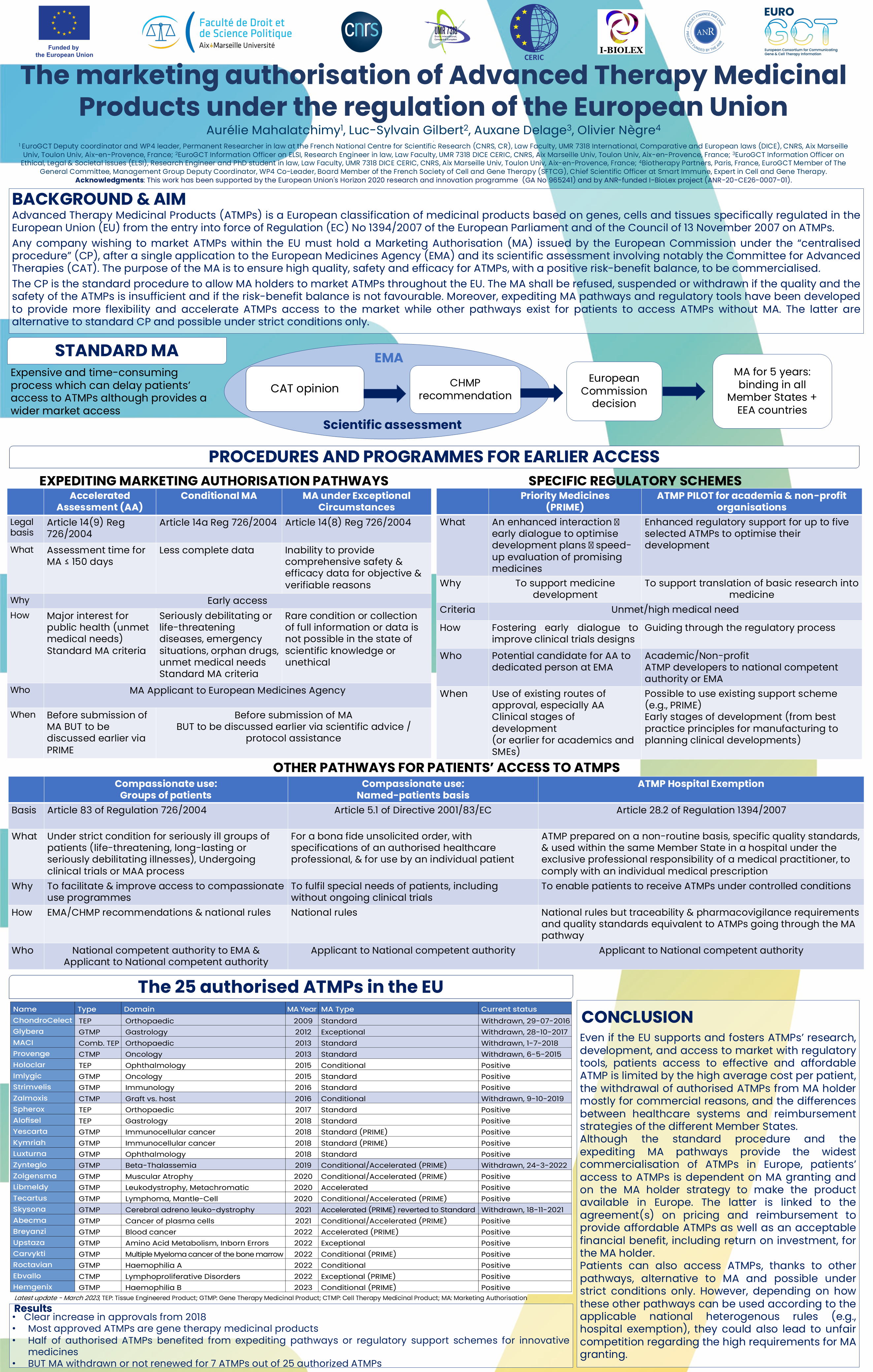 From the adoption of the EU regulation, 24 ATMPs have been granted a marketing authorisation in the EU and the European Commission decision is pending for another one. There has been a clear increase in approvals from 2018, and most approved ATMPs are gene therapy medicinal products. Almost half of them benefited from expediting pathways or regulatory support schemes for (innovative) medicines to be commercialised in the EU. Nevertheless, MA has been withdrawn or not renewed for 7 of them. This poster will present the European regulatory requirements and pathways for ATMPs to obtain marketing authorisation, and discuss the challenges of their commercialisation.