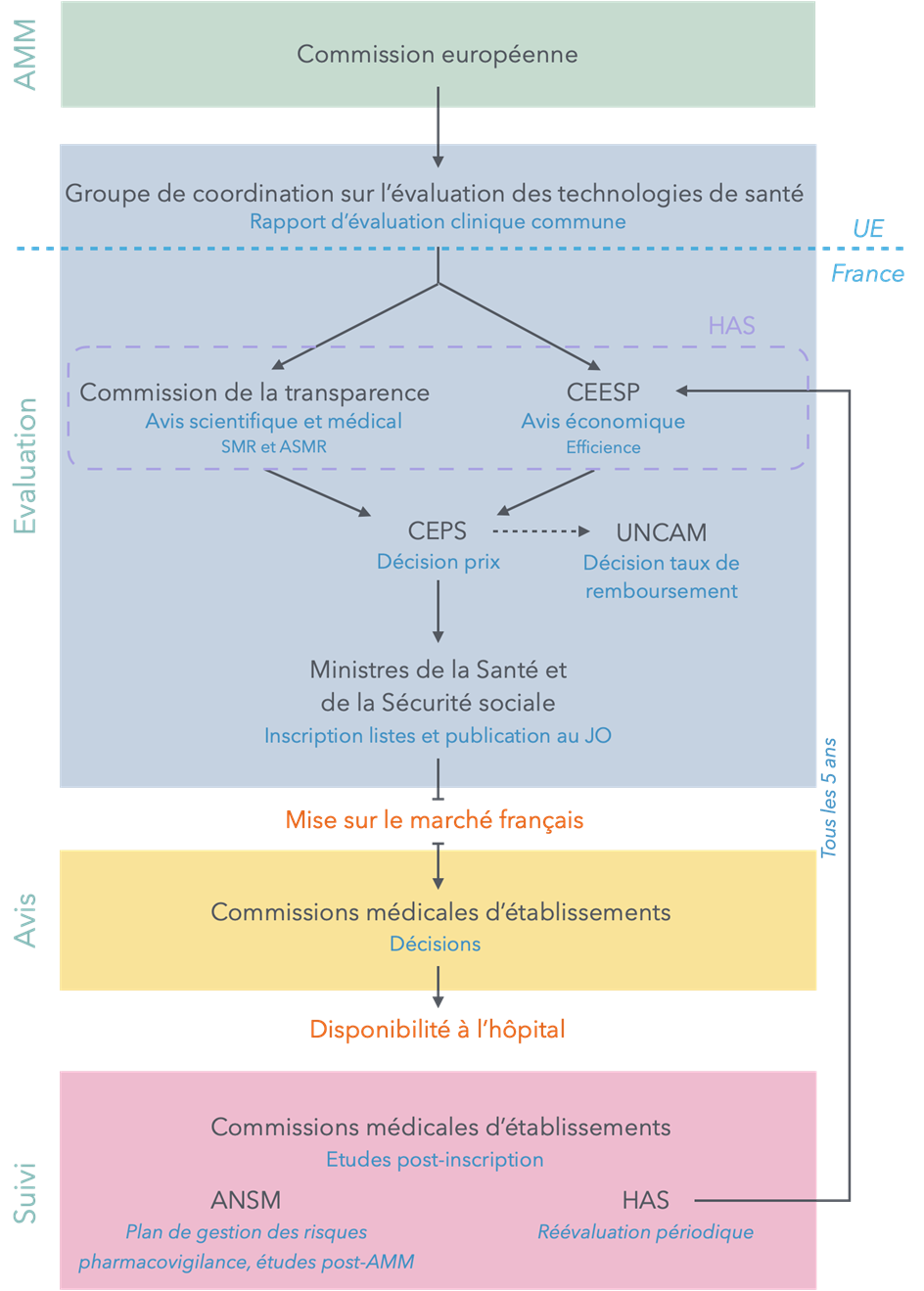Schéma inspiré des sources suivantes : HAS, Le rôle de la HAS dans l’accès au remboursement des médicaments - Rencontre 28/03/2019, disponible ici ; A. Mahalatchimy, A. Faulkner, Patients’ access to cell- based regenerative therapies: the reimbursement challenge in the UK and France, 5th Conference of the European Association of Health Law (EAHL), 1 – 2 October 2015, Prague, Czech Republic. (Poster); Assemblée Nationale, rapport d’information déposé en application de l’article 145 du Règlement par la commission des affaires sociales en conclusion des travaux de la mission d’information sur les médicaments et présenté par Mme Audrey Dufeu et M. Jean-Louis Touraine, Députés, 23 juin 2021, N°4275, p.27, disponible ici.