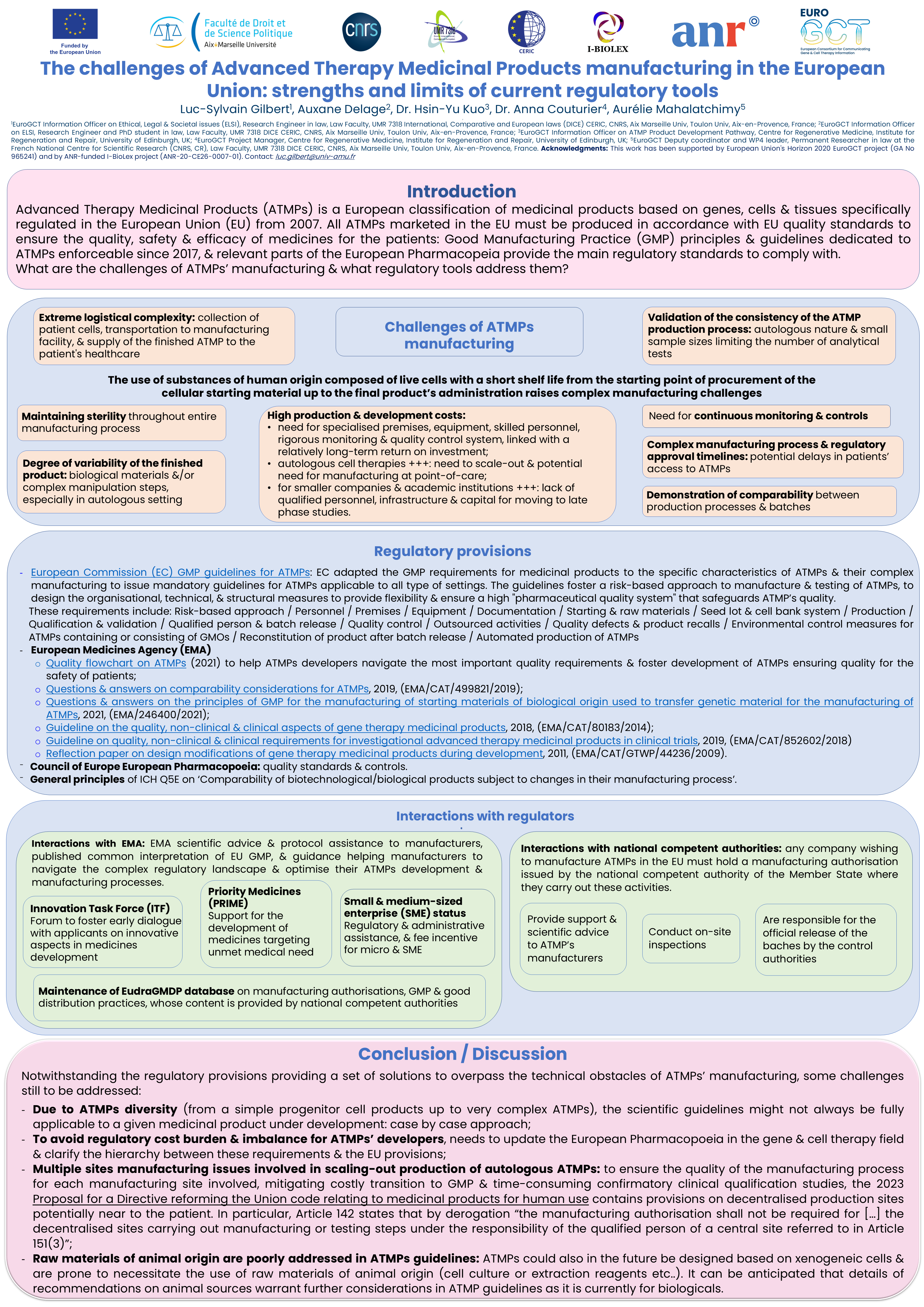 Ensuring the quality of medicines is a criterion to obtain ATMPs’ marketing authorisation issued by the European Com-mission under the ‘‘centralised procedure’’ after a single application to the European Medicines Agency. All ATMPs marketed in the EU must be produced in accordance with EU quality standards to ensure the quality, safety and efficacy of medicines for the patients: Good Manufacturing Practice (GMP) principles and guidelines dedicated to ATMPs enforceable since 2017, and relevant parts of the European Pharmacopeia provide the main regulatory standards to comply with.