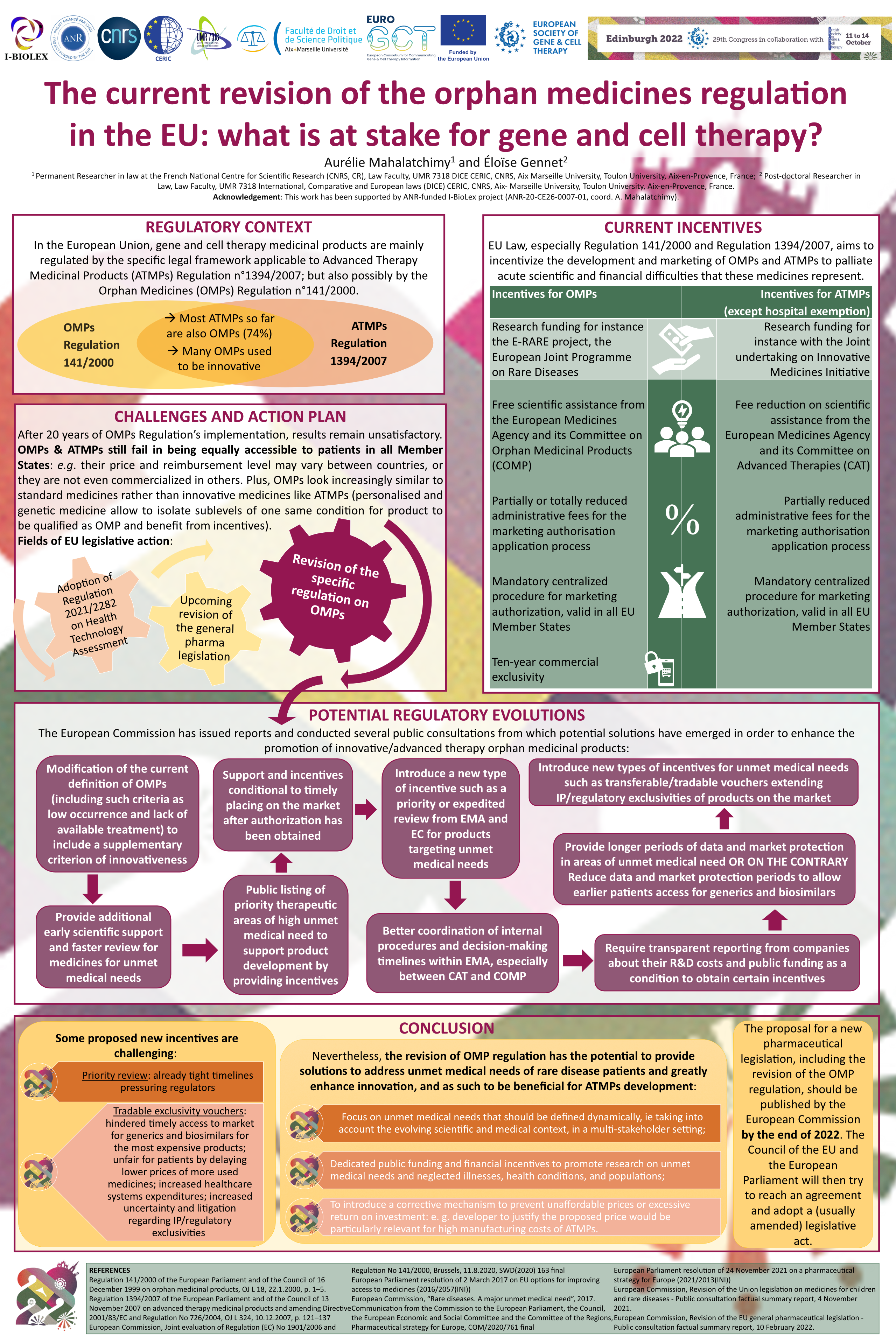 In the European Union, gene and cell therapy medicinal products are mainly regulated by the specific legal framework applicable to Advanced Therapy Medicinal Products (ATMPs): regulation (EC) n°1394/2007. Yet most ATMPs that have been authorised for marketing in the European Union are also classified as orphan medicinal products. The latter are regulated by a different but also specific legal instrument : Regulation (EC) n°141/2000, which aims to promote the development of innovative medicines for orphan diseases thanks to a set of incentives for investigators. However, after twenty years of implementation, results are still unsatisfactory for several reasons. One of these reasons is that the market of orphan medicinal products had ‘‘started to look more similar to ‘standard’ medicines’’ than innovative medicines like ATMPs. Moreover, it has also been observed that even when marketed, orphan medicinal products fail in being equally accessible to patients in the different Member States. The European Commission has started a long and thorough revision process of the pharmaceutical legislation in order to give a new impulse to the development of, and access to, truly innovative orphan medicinal products, which may have a positive impact for patients as well as for investigators working on gene and cell therapies. In this poster, we will discuss what aspects of the revision of the regulation on orphan medicinal products may have an impact on the development of gene and cell therapy in the European Union.