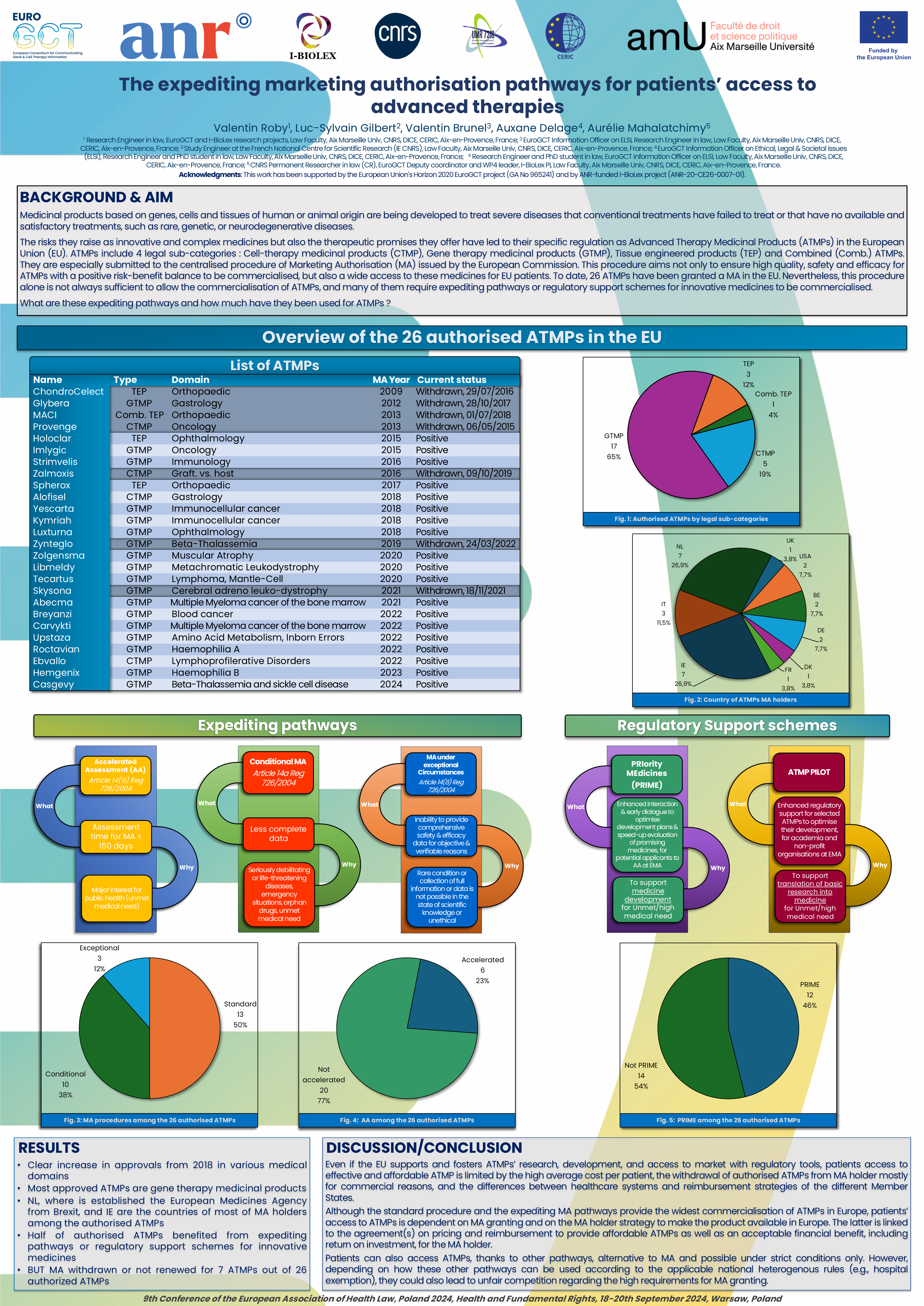 Starting from the centralised procedure as the strongest and first legal procedure for the widest and safest patients access to these innovative medicines, this poster will provide an overview of the European MA expediting pathways and of their use, for ATMPs to be accessible, and discuss the challenges of their quick but safe commercialisation.