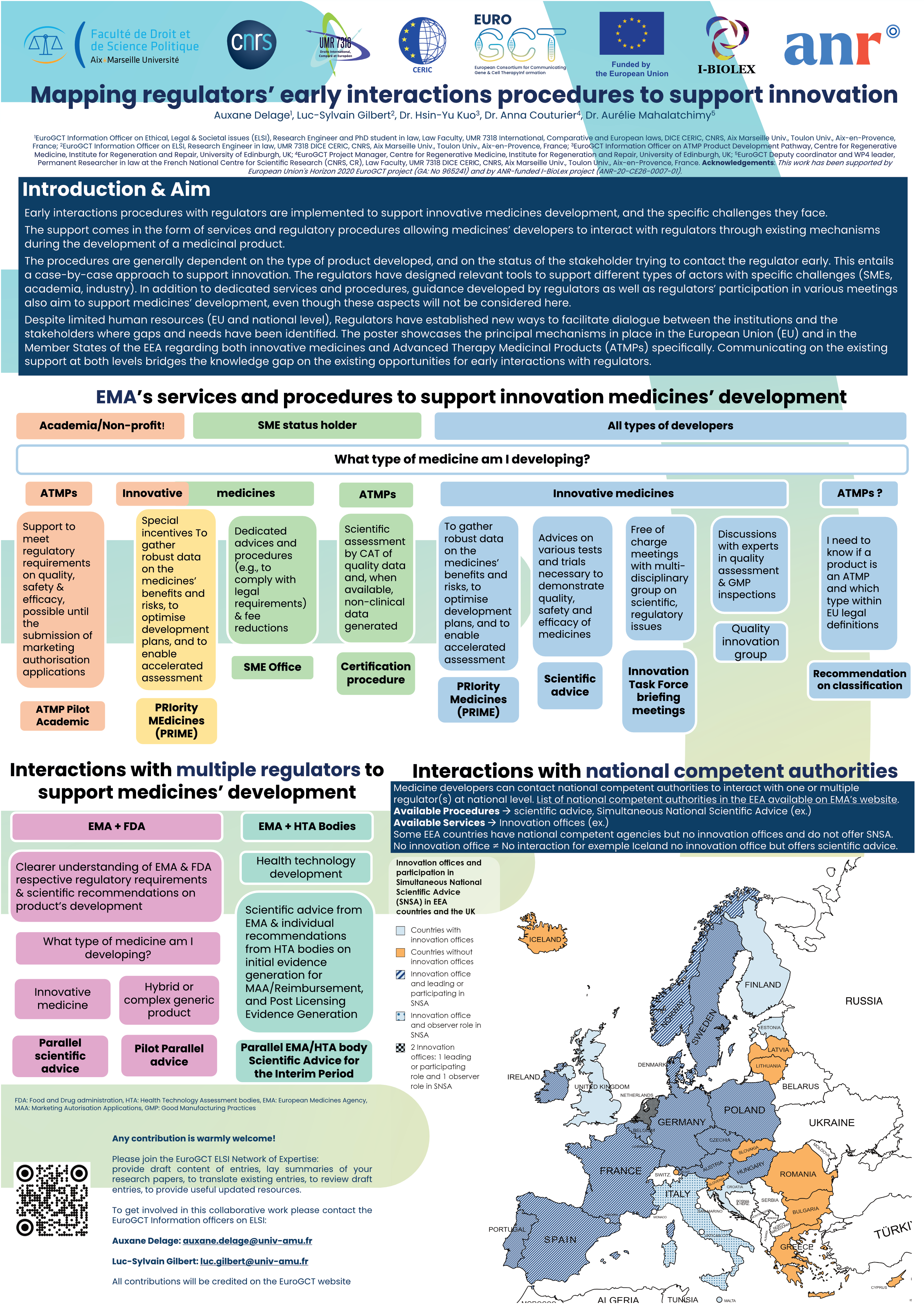 This poster describes and discusses the multiple existing options available to ATMPs’ developers to overcome challenges during the pre-marketing authorisation phase through early interactions with regulators, here focusing on the European Medicines Agency and National agencies. Communicating on the early procedures available at national and European levels will help to identify potential gaps and raise developers’ awareness of the different procedures available to support the marketing authorisation of ATMPs.